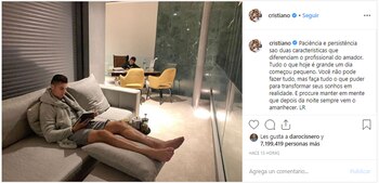 “La paciencia y la persistencia son dos características que diferencian a los profesionales de los aficionados. En cualquier momento un gran día comienza como uno pequeño, aunque no puedes hacer todo, haz todo lo que puedas para que tu sueño sea una realidad. Y trata de tener en cuenta que después de la noche siempre viene el amanecer”, escribió el portugués en su cuenta de Instagram junto a una foto en la que apareció recostado y leyendo sobre un sillón, mientras que su hijo escribía en el escritorio.