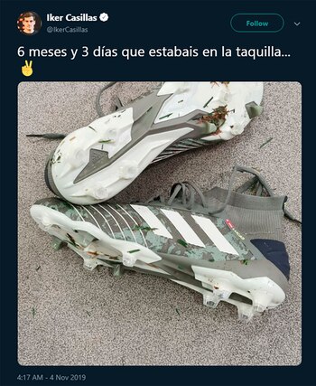 El arquero madrileño puso una foto con sus botas y el mensaje “6 meses y 3 días que estabais en la taquilla”, acompañado de un emoticón con el símbolo de la victoria. Es justo el tiempo que ha pasado desde que sufrió el ataque cardíaco, cuando estaba en una sesión de entrenamiento con el Porto.