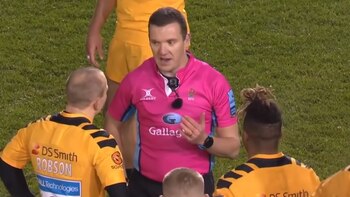 Del otro lado, el back de los Wasps Paolo Odogwu saltó para atrapar la guinda y una vez que la controló estiró innecesariamente su pierna izquierda para detener la llegada de su rival Janse van Rensburg.