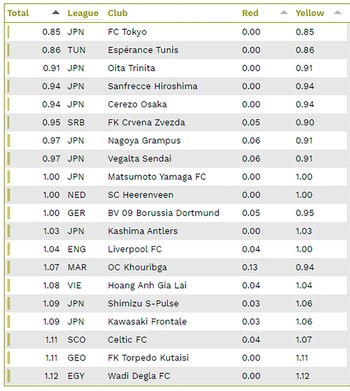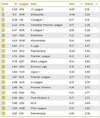 Si el listado se invierte, se puede descubrir que el continente más limpio en cuanto a juego es el asiático: figuran tres de las cinco ligas con menos tarjetas por partido. En promedio, en la J1 League de Japón los árbitros solo muestran sus cartulinas 2,26 veces por encuentro, siendo éste el certamen con menos roce del mundo, seguido por Noruega y Vietnam. En el listado siguen Canadá, Corea del Sur, Holanda, Suecia, Lituania, Escocia e Inglaterra.