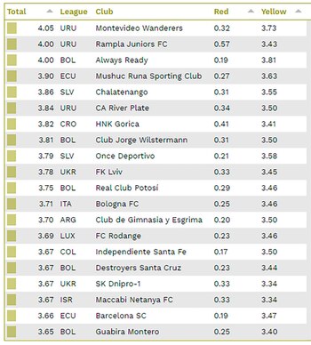 El Observatorio de Fútbol actualizó su ranking de las ligas que más tarjetas amarillas y rojas acumulan a lo largo de una temporada, en promedio por la cantidad de partidos. El organismo recopila información de 92 países y luego establece un listado no sólo de los torneos sino además de los propios clubes.