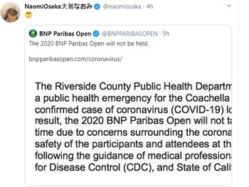 En un comunicado de la organización publicado en la cuenta de Twitter del torneo se anunció que “el departamento de salud pública del Condado de Riverside ha declarado la emergencia sanitaria para el valle de Coachella luego de un caso confirmado de COVID-10. Como resultado, el BNP Paribas Open no se llevará a cabo debido a la preocupación respecto al coronavirus y la seguridad de los participantes y asistentes al evento. Esto bajo la guía de profesionales de la salud, el Centro de Control de Emergencias y el estado de California”.