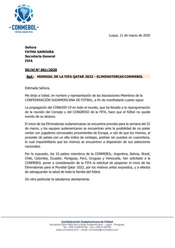 La Confederación Sudamericana de fútbol (Conmebol) solicitó esta noche a FIFA en forma oficial la suspensión de las eliminatorias sudamericanas que debían iniciarse a fines de marzo, con miras al Mundial Qatar 2022, a raíz de la expansión de la pandemia del Coronavirus.