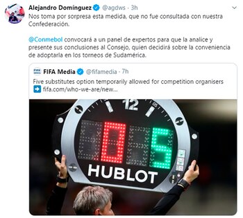 “Nos toma por sorpresa esta medida, que no fue consultada con nuestra Confederación”, sostuvo Domínguez en un mensaje a través de su cuenta de Twitter. Luego, agregó: “Conmebol convocará a un panel de expertos para que la analice y presente sus conclusiones al Consejo, quien decidirá sobre la conveniencia de adoptarla en los torneos de Sudamérica”.