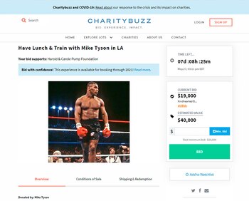 “¡Ten el mejor día con Mike Tyson! Usted y un amigo entrenarán y disfrutarán del almuerzo con Mike Tyson en Los Ángeles. También recibirá un guante de boxeo y una camiseta autografiados”, asegura la página Charitybuzz.
