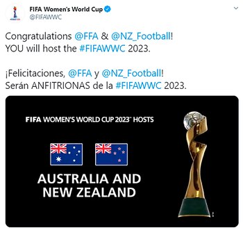 La espera terminó y el Consejo de Fútbol de la FIFA se expidió: el próximo Mundial Femenino se llevará a cabo en Australia y Nueva Zelanda en 2023. A pesar de que Colombia también había pujado para quedarse con la organización del evento, finalmente se llevará a cabo por primera vez en Oceanía: la votación terminó 22 a 13. Vale la pena recordar que ambos países también serán sedes del Mundial Sub 20 femenino que se realizará un año antes.