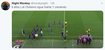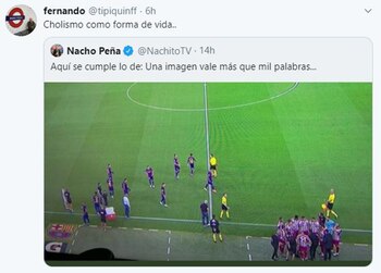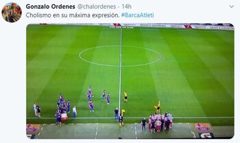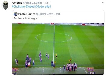 “Filosofía Ibai Llanos: “Si la pausa dura 60 segundos, yo me quedo hasta el 61″, escribió el columnista de Diario Marca Nacho Palencia sobre esta escena, retomando las palabras del Youtuber que es una de las personalidades del momento en España. La escena fue el disparador para su descargo: “En ese momento el Atlético luchaba en el Camp Nou por no perder la distancia con el Sevilla, aguantar la tercera plaza y dejar en bandeja la Liga a su eterno rival, el Real Madrid. Todos unidos, bien juntos y tratando de mostrar que al fútbol no solo se juega con los pies. A su izquierda, el todopoderoso Barça de Leo Messi. Un conjunto que se cae muy poco pero que no sabe levantarse, mostrando que solo reconocen ser equipo cuando todo funciona. La imagen es significativa y aunque bien es cierto que segundos antes estaban formando una ‘piña’ más o menos decente, no tardaron ni dos segundos en disolverse. El Atleti no”.
