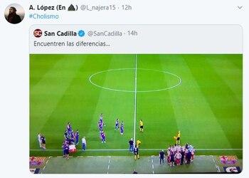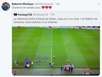 Esto también destacó el periodista Javier Gascón desde el medio catalán Mundo Deportivo a partir de la imagen viral: “Eder Sarabia, que no se había levantado del banquillo hasta entonces, salió. Setién ya estaba de pie. Messi llegó el último, dando pasitos cortos, cada vez más cortos, tanto que casi no llega y se queda sin agua. Pero Sarabia ya sabía a quién no se debía dirigir y a quién sí. Y, claro, eligió a Riqui Puig para taladrarle la oreja. Setién habló con Vidal, que también recibió alguna indicación de Eder al final. El resto, pues eso, se refrescó. El dibujo que se veía desde arriba sí era indicativo. Círculo perfecto el del Atlético, todos alrededor de Simeone, muy cerca, los soldados pendientes de su general en el ejercito colchonero. Un ‘huevo’, por decir algo, en el Barça, con los jugadores más dispersos y separados de sus entrenadores, que no estaban en el centro”.