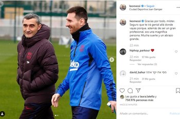 El ciclo de Ernesto Valverde en Barcelona finalizó de manera abrupta pese a su alto porcentaje de puntos y a los 4 títulos que consiguió en dos temporadas y media (una Copa del Rey, dos Ligas y una Supercopa de España). Lionel Messi, quien guardaba una gran relación con el DT saliente, utilizó su cuenta de Instagram para dejarle un sentido mensaje de despedida. “Gracias por todo, míster. Seguro que te irá genial donde vayas porque, además de ser un gran profesional, sos una magnífica persona. Mucha suerte y un abrazo grande”, fueron las palabras que utilizó el capitán del conjunto azulgrana.