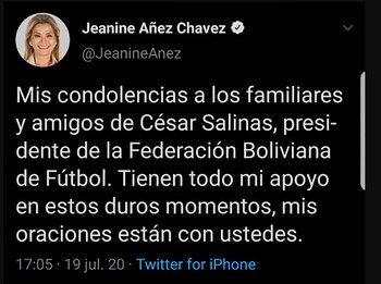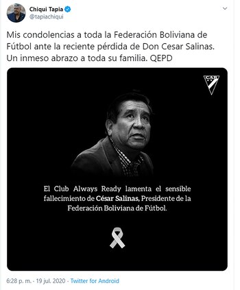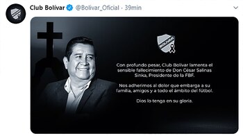 También se expresó Claudio Tapia, presidente de la Asociación del Fútbol Argentino (AFA): “Mis condolencias a toda la Federación Boliviana de Fútbol ante la reciente pérdida de Don Cesar Salinas. Un inmenso abrazo a toda su familia. QEPD”. A su vez, clubes como Bolivar, Real Potosí, Always Ready, Blooming y Guabirá, también dejaron mensajes en las redes sociales.