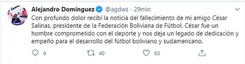 La noticia de la muerte de Salinas fue comunicada por la Confederación Sudamericana de Fútbol en un comunicado: “La CONMEBOL y la familia del fútbol sudamericano lamentan profundamente el fallecimiento del señor César Salinas, presidente de la Federación Boliviana de Fútbol. Hacemos llegar nuestras más sentidas condolencias a su familia, así como a amigos y compañeros de la FBF”.