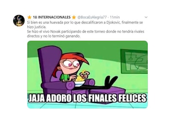 Por supuesto, inmediatamente se conoció la descalificación del serbio los memes inundaron las redes sociales. Desde las hipotéticas reacciones de celebración de Roger Federer y Rafael Nadal, con quien está enfrentado por la intención de Novak de armar una liga paralela a la ATP, hasta los reclamos de la jueza, quien lo miró con cara de pocos amigos.
