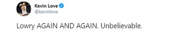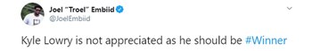 Tan valiosa fue la actuación de Lowry para los últimos campeones de la NBA que, rápidamente, su acción definitoria generó la reacción de otras estrellas de la liga. Kevin Love, figura de los Cleveland Cavaliers, escribió en su cuenta oficial de Twitter: “Lowry una y otra vez. Increíble”. Por su parte, Joel Embiid, estrella de Philadelphia 76ers, fue contundente al disfrutar el gran partido que tuvo el base de los Raptors. “Kyle Lowry no es apreciado como debería ser #Ganador#”, tuiteó el gigante de Camerún.