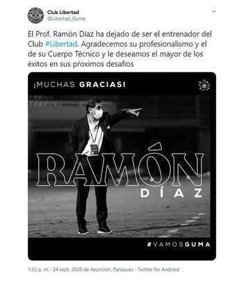 La entidad guaraní emitió un comunicado oficial: “El Prof. Ramón Díaz ha dejado de ser el entrenador del Club Libertad. Agradecemos su profesionalismo y el de su Cuerpo Técnico y le deseamos el mayor de los éxitos en sus pŕoximos desafíos”. Así, se completó la duodécima experiencia del estratega de 61 años que dirigió a River (tres ciclos), San Lorenzo (dos), América de México, Independiente de Avellaneda, la Selección de Paraguay, Al-Hilal y Al-Ittihad de Arabia Saudita y Pyramids de Egipto.