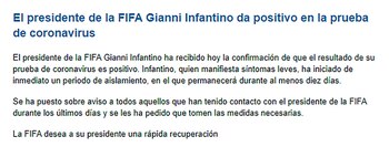 Por otra parte, además de desearle una rápida recuperación, en este escrito también se informó que se le ha dado aviso a los contactos estrechos de Infantino, dentro de los que lógicamente hay varios de sus colegas: “Se ha puesto aviso a todos aquellos que han tenido contacto con el presidente de la FIFA durante los últimos días y se les ha pedido que tomen las medidas necesarias.”