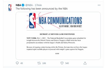 Se consideró que todos los jugadores de los Pistons era contactos estrechos, y el equipo no tuvo el mínimo de ocho jugadores disponibles que se requieren por la liga para continuar con el juego de esta noche contra los Nuggets. Por eso algunos partidos se han jugado más allá de que algunos planteles presentaron casos de coronavirus en lo que va de la temporada.