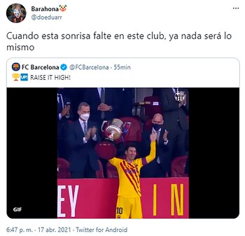 Si se marchará o no una vez que finalice su vínculo con el club catalán el próximo 30 de junio es algo que sólo él conoce. Lo que está claro es que tal vez este puede ser su último título en el Barcelona, donde ya sumó 35 campeonatos desde que debutó profesionalmente. Además, es uno de los futbolistas con más conquistas en la historia del fútbol. La chance de estirar su palmarés será en la Liga, donde quedan ocho fechas para el cierre y el equipo marcha tercero a dos unidades del líder Atlético de Madrid y a uno del escolta Real Madrid.