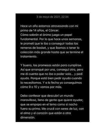 “Como sabrán el ánimo juega un papel fundamental, por lo que hace una semanas le prometí que le iba a conseguir todas las remeras de basket, y que íbamos a tener la colección más grande hasta que se termine el tratamiento”, escribió la joven uruguaya.
