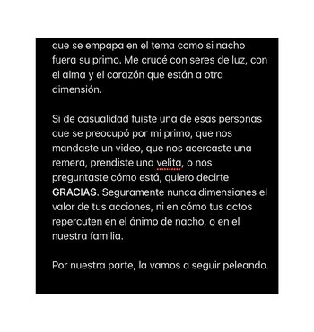 La joven uruguaya explicó que quedó conmovida con las muestras de afecto del público para con su primo. “Si de casualidad fuiste una de esas personas que se preocupó por mi primo, que nos mandaste un video, que nos acercaste una remera, prendiste una velita, o nos preguntaste cómo está, quiero decirte GRACIAS”, explicó.