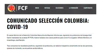 “El cuerpo técnico de la Selección Colombia Masculina de Mayores informa que, siguiendo los protocolos de bioseguridad fueron realizadas las pruebas RT PCR y fueron hallados dos casos positivos para covid-19, el jugador Alfredo Morelos y el kinesiólogo José Rendón. Tras conocerse los resultados positivos, siguiendo los protocolos, se realizó el respectivo aislamiento de las dos personas, quienes de momento, se encuentran asintomáticos”, informó la Federación Colombiana de Fútbol (FCF).
