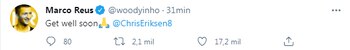 Además, Luka Modric, capitán de la selección de Croacia, también hizo lo propio: “Eriksen”, redactó el subcampeón del mundo en el Mundial de Rusia 2018 y le sumó dos emojis de las manos en forma de rezo. El delantero del Manchester United y de la selección inglesa Marcus Rashford, el arquero de Brasil y del Liverpool, Alisson Becker, así como el colombiano Falcao y el alemán Marco Reus también se sumaron al pedido de mejora de salud que se hizo viral a través de las diferentes plataformas.