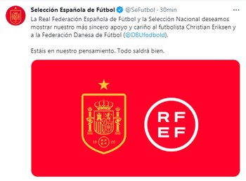 Clubes como el Tottenham, Liverpool, Manchester City de la Premier League, la Roma de Italia y varias cuentas oficiales de seleccionados como la de Panamá, México y España, también dejaron sus mensajes de aliento. “La Real Federación Española de Fútbol y la Selección Nacional deseamos mostrar nuestro más sincero apoyo y cariño al futbolista Christian Eriksen y a la Federación Danesa de Fútbol. Estáis en nuestro pensamiento. Todo saldrá bien”, escribió la federación ibérica.