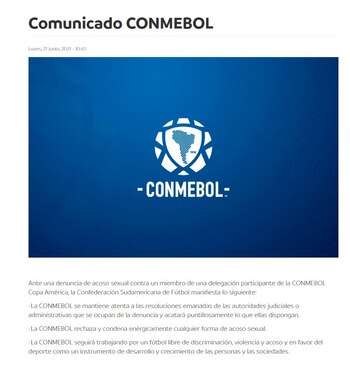En un comunicado aparte, la CONMEBOL confirmó que estaba al tanto de una denuncia de acoso sexual contra un empleado de una selección en la Copa América. Añadió que cooperarían con las autoridades en la investigación.