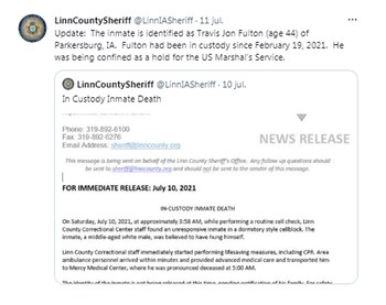 “El personal del Correccional del Condado de Linn inmediatamente comenzó a tomar medidas urgentes para salvar vidas, incluido el RCP. La ambulancia llegó en minutos y le brindó atención médica avanzada antes de trasladarlo al Mercy Medical Center, donde fue declarado fallecido a las 5 de la mañana”, explicaron desde el Twitter oficial del lugar.