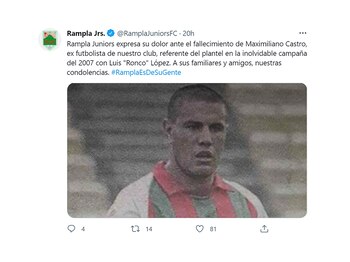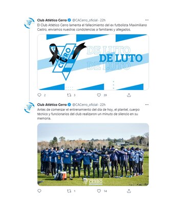La Mutual Uruguaya de Futbolistas Profesionales (MUFP) expresó su dolor en redes sociales con un mensaje que también replicó la Asociación Uruguaya de Fútbol (AUF): “La MUFP está de luto por el fallecimiento de Maximiliano Castro, ex futbolista y dirigente de la Mutual. Nuestras condolencias para su familia y amigos”.