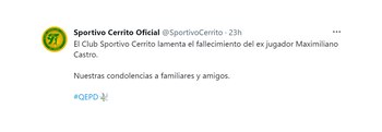Central Español, club en el que se formó y con el que debutó en la máxima categoría, dio a conocer la primer información sobre su muerte: “Lamentamos informar el fallecimiento de Maximiliano Castro, ex jugador de nuestra institución y formado en nuestras juveniles. Nuestro más sentido pésame a sus familiares y amigos”. Es el tercer hecho de características similares en el fútbol charrúa en las últimas dos semanas tras lo ocurrido con Williams Martínez y Emiliano Cabrera.