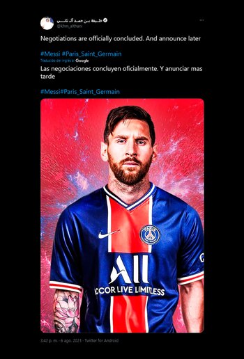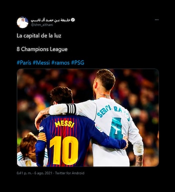 “Las negociaciones han terminado de manera oficial y el anuncio se hará más tarde”, escribió Khalifah Bin Hamad Al.Thani este viernes, junto a una imagen que consta de un montaje en el que se ve a Messi con la camiseta del PSG. Más tarde, el hermano del Emir de Qatar compartió una foto del ya ex futbolista del Barcelona junto a Sergio Ramos cuando este último jugaba en el Real Madrid y añadió: “La capital de la luz, 8 Champions League”, en alusión a los títulos europeos que suman entre ambos.