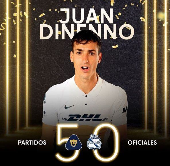 Ahora en el juego contra el Cub Puebla, Dinenno sumó 50 juegos oficiales con los colores azul y oro de los Pumas. Por medio de las redes sociales del club, felicitaron al delantero por los partidos en los que ha participado con la institución.
