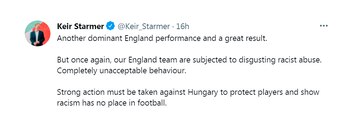 Y otro de mensajes más fuertes fue el del líder laborista Keir Starmer: “Otra actuación dominante de Inglaterra y un gran resultado. Pero una vez más, nuestro equipo fue víctima de abusos racistas repugnantes. Comportamiento completamente inaceptable. Deben tomarse medidas enérgicas contra Hungría para proteger a los jugadores y demostrar que el racismo no tiene cabida en el fútbol.”