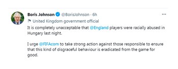 “Es totalmente inaceptable que los jugadores de la selección inglesa fueran objeto de insultos racistas anoche en Hungría”, denunció el primer ministro británico Boris Johnson a través de su cuenta de Twitter.