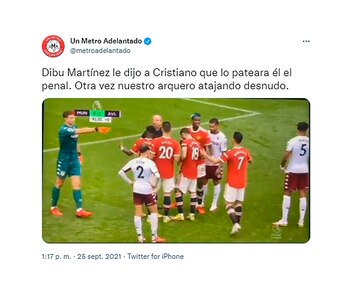El nombre de Emiliano Martínez rápidamente escaló en las redes sociales hasta posicionarse como una de las tendencias en distintos puntos del mundo después de su provocativa reacción en el penal que tuvo el Manchester United para igualar el partido ante Aston Villa en tiempo de descuento del encuentro correspondiente a la 6ª fecha de la Premier League. El Dibu otra vez sacó a relucir el trash talk que lo hizo viral durante la Copa América y desafío a Cristiano Ronaldo a ejecutar la pena máxima que finalmente fallaría Bruno Fernandes.