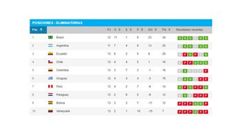 Brasil acompaña a Alemania y Dinamarca y al anfitrión Catar como los primeros clasificados a la cita mundialista del año próximo. El triunfo en Sao Paulo contra Colombia volvió a mostrar la marcada supremacía de Brasil en la clasificatoria regional, en la que acumula 11 triunfos, un empate y ninguna derrota (tiene un partido suspendido con Argentina). Brasil, ahora con 34 puntos, le saca una diferencia de nueve a su escolta Argentina pero las dos potencias sudamericanas tienen su partido suspendido de la sexta fecha por invasión del campo de juego de agentes sanitarios brasileños en Sao Paulo. Antes de una decisión de la FIFA, el líder de la eliminatoria y su escolta se volverán a ver las caras el martes próximo en San Juan (oeste de Argentina) en una nueva edición del superclásico sudamericano.