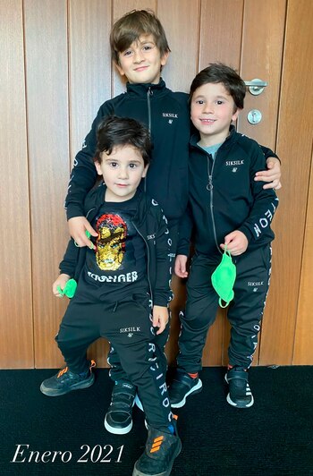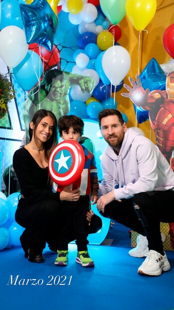 Ya en marzo, cumplió años Ciro y la temática utilizada para el festejo fue de superhéroes de Marvel y el más pequeño de los cinco se disfrazó de Capitán América acompañado por sus padres. Los tres hijos de la pareja volvieron a protagonizar la foto de abril esta vez en forma de selfie tomada por Roccuzzo, que portó un barbijo color rosa. ¿El detalle? Tiago vestido con un buzo del blaugrana a pocas semanas de que su padre de un inesperado volantazo en su carrera profesional.