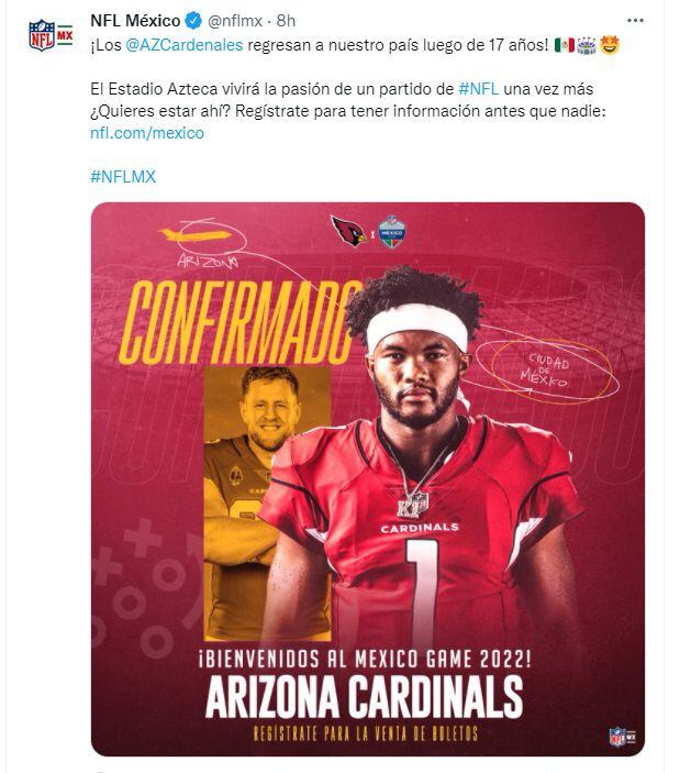 “En 2005, cuando los Cardinals organizaron el primer partido de la temporada regular de la NFL jugado fuera de los Estados Unidos, experimentamos de primera mano el extraordinario apoyo y la increíble pasión de nuestros fanáticos en México. Sabemos que ha aumentado exponencialmente en los años posteriores y estamos encantados de regresar a la Ciudad de México y al Estadio Azteca en 2022″, expuso Bidwill.