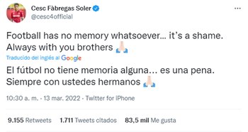 Fábregas contó un episodio similar que sufrió en el Barcelona, pero marcó una gran diferencia con lo que le ocurrió a su amigo: “A mí me ha pitado el Camp Nou y yo sé lo que es. Entiendo que las aficiones a veces quieren crear un momento de tensión para que los jugadores se den cuenta de que, bueno, debería hacer más, o no están contentos con el uno o con el otro. Pero yo creo que, durante el partido, ahí se tiene que apoyar al jugar siempre”.