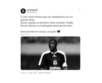 El Corinthians de Brasil, club que también lo vio vestir sus colores, se pronunció en Twitter: “Con mucha tristeza nos despedimos de un gran ídolo. Nuestro capitán en el primer título mundial, Freddy Rincón falleció esta madrugada del jueves. Eternamente en nuestros corazones. Gracias por todo, capitán”.
