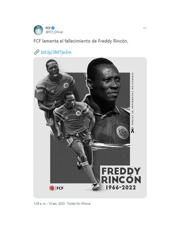 “Nos unimos a muchos en el mundo del fútbol para recordar a Freddy Rincón. Vaya nuestro más sentido pésame para sus seres queridos, ex compañeros y aficionados de los clubes en los que jugó y de la selección nacional, a la que representó en tres mundiales. Descanse en paz”, transmitió la entidad que regula el fútbol mundial en redes sociales.