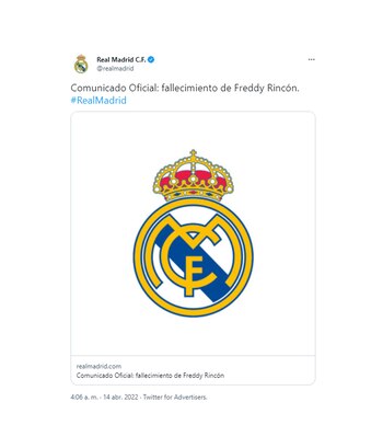 El Real Madrid, su presidente y su Junta Directiva, “lamentan profundamente el fallecimiento de Freddy Rincón, jugador del Real Madrid entre 1995 y 1996″, expresó el equipo merengue a través de un comunicado oficial que publicó en su página web. “El Real Madrid quiere expresar sus condolencias y su cariño y afecto a todos sus familiares, a sus compañeros y técnicos, a sus clubes y a todos sus seres queridos. Rincón ganó 1 Mundial de Clubes y 2 Ligas de Brasil con el Corinthians, 2 Ligas de Colombia con el América de Cali y 1 Copa de Colombia con el Independiente Santa Fe”, puntualizó.