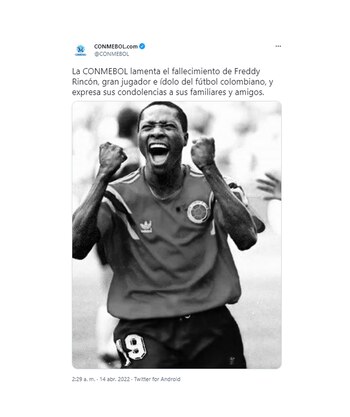 Alejandro Domínguez, presidente de la Conmebol, publicó en su cuenta de Twitter: “Lamento profundamente la partida de Freddy Rincón. Gracias por dejar tu huella en el fútbol sudamericano. Envío mis condolencias a sus familiares y al fútbol colombiano”, mientras que el ente que rige el fútbol sudamericano agregó: “La CONMEBOL lamenta el fallecimiento de Freddy Rincón, gran jugador e ídolo del fútbol colombiano, y expresa sus condolencias a sus familiares y amigos”.