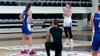La romántica escena se dio en el tramo final del partido de vuelta entre el equipo de Violeta, el ZKK Buducnost Bemax, y el ZKK Podgorica de la liga femenina de Montenegro. Allí, el árbitro esperó a que su novia se preparara para lanzar un libre directo y en ese momento la detuvo y se arrodilló ante ella para sorpresa de todos los presentes en el recinto.