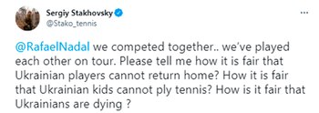 “Nos hemos enfrentado en el circuito. Dime si es justo que los jugadores ucranianos no puedan regresar a casa. Dime si es justo que los niños ucranianos no puedan jugar al tenis. Dime si es justo que los ucranianos estén muriendo”, escribió el ex número 31 del mundo en su cuenta de Twitter.