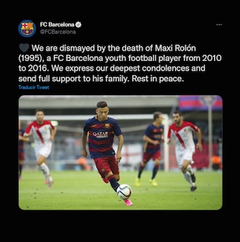 Maxi, de 27 años, había saltado a la fama hace casi una década atrás cuando desembarcó en La Masía del Barcelona. Si bien no llegó a tener minutos en el primer equipo, sí militó dos temporadas en el Barça B y fue clave en la obtención de la primera UEFA Youth League en 2014. El club publicó un comunicado tras enterarse de la noticia: “Consternados por la muerte de Maxi Rolón (1995), jugador del fútbol base del FC Barcelona entre 2010 y 2016. Expresamos nuestro más sentido pésame y todo el apoyo a su familia. Descanse en Paz”.