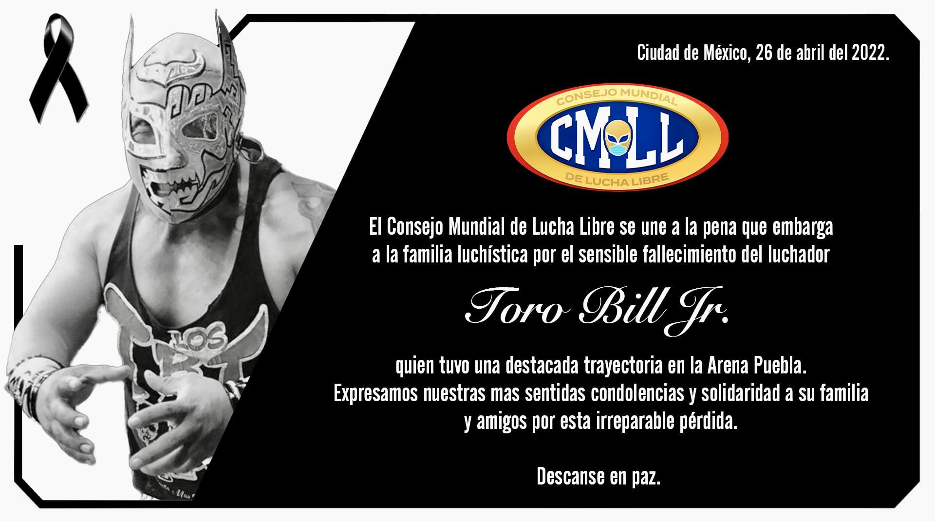 Apenas el pasado 26 de abril, a través de las redes sociales del Consejo Mundial de Lucha Libre (CMLL), se dio a conocer la muerte del luchador mexicano Toro Bill Jr, un destacado del pancracio nacional, oriundo del estado de Puebla.