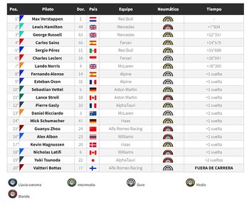 En la penúltima vuelta hubo un auto de seguridad virtual y empezó a llover lo que le dio dramatismo a la definición, pero esto no afectó el éxito de Verstappen, quien alcanzó su octava victoria en la temporada y amplió su ventaja en la cima del campeonato ya que llegó a 258 puntos y le sacó 80 de a Leclerc