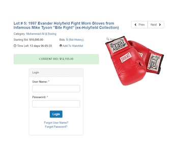 Ahora el épico combate volvió a ser noticia ya que la página de subastas Lelands Auctions publicó los guantes de Holyfield que tienen una oferta inicial de 10 mil dólares y la misma vencerá en 13 días. Según informó el portal a TMZ Sports los guantes de boxeo de Holyfield tienen escasas muestras de uso. Ya tuvieron cinco ofertas y por ahora la marca más alta es de 12.155 dólares, pero se espera que esa suma se supere y, según el mencionado sitio, el valor de los guantes podría llegar a las seis cifras en dólares durante la subasta.