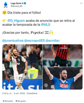 A modo de recorrido en su trayectoria, Gonzalo luego pasó al fútbol italiano y la principal liga local manifestó: “Día triste para el fútbol. Gonzalo Higuaín acaba de anunciar que se retira al acabar la temporada de la MLS. ¡Gracias por tanto, Pipita!”.